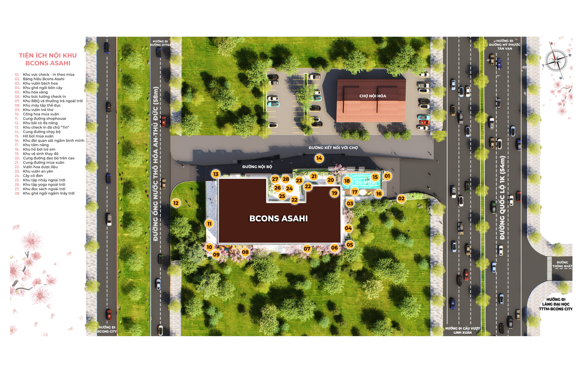 Từ dự án, cư dân dễ dàng Cư dân Bcons Asahi kết nối hệ thống tiện ích ngoại khu phong phú như giáo dục, y tế, mua sắm giải trí.